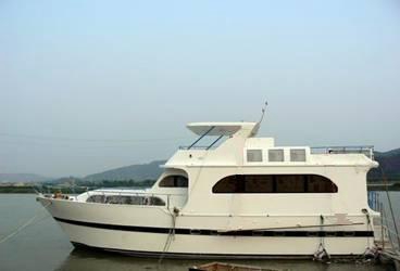 這艘房船總長(zhǎng)為16.76米,型寬為5.49米,上下總共三層。船的主色調(diào)為米白色。雅致的米白色嵌上玻璃窗的茶褐色,又綴以不銹鋼圍欄閃現(xiàn)的耀眼光澤,這一切裹在敦實(shí)厚重的船身上,令人感覺一股男人特有的紳士風(fēng)度幾欲翩翩而出。厚重的船體使得航行的穩(wěn)定性有了可靠的保障,而整潔的色澤讓船的柔和觀感觸手可及。